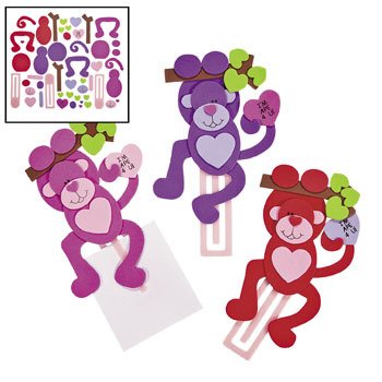 Valentine Monkey Bookmark Craft Kit. Kids love to monkey around while making these foam and plastic bookmarks! With heart-shaped bellies these crazy apes make a cute craft activity for a zoo-themed Valentine's Day party at day care or preschool. Assorted colors. 7". All craft kit pieces are pre-packaged for individual use. Kits include instructions and extra pieces. OTC Age Recommendation Ages 5 & Up Containing medium-sized pieces with the occasional angular edge these lightweight to sturdy crafts may require some assembly such as stringing beads or gluing items to create a 3-dimensional project